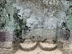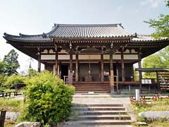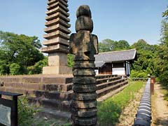 「十三重石寶塔」の一番下の部分には、風化していますが四方に如来像が彫ってあります。東=薬師如来、西=阿弥陀如来、南=釈迦如来、北=弥勒如来です。写真は、釈迦如来、弥勒如来と本堂です。