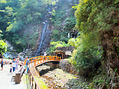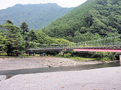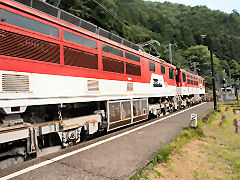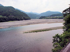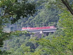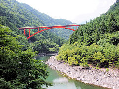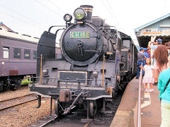 この蒸気機関車で、新金谷駅から千頭(せんず)駅まで乗りました。蒸気機関ですから冷房など無いから暑かったですが、窓から入る石炭の香りを乗せた風は、意外と涼しく思ったものです。車窓から大井川が眺めることができます。(動 画)