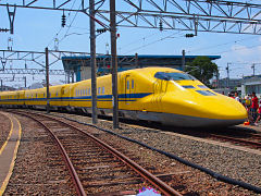 人気の新幹線「ドクターイエロー」です。「新幹線電気軌道総合試験車」というそうで、線路や架線の状態、電気的信号等を計測しながら、新幹線の状態を総合的に診断する業務用の車両のことです。これを見ると幸せになれるという列車ですが、走っている日時は発表されないという秘密の列車なので、更に人気が高まっているようです。