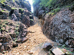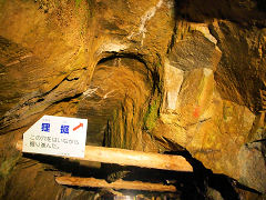 あちこちに、人が這って通った江戸時代の坑道に「狸堀り」のノミの跡が残っています。狭いところをノミで掘れば一日で何cm掘れるのでしょうか。江戸時代の過酷な労働が偲ばれます。