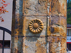 明治9年(1876年)に、生野製鉱所が完成しその正門として設置されました。明治22年に皇室財産となり明治29年に三菱合資会社に払下げ、昭和45年に坑道が岩盤の圧力により突然崩壊する「山はね」現象が起こり、昭和48年についに閉山という明治以降の歴史を見守った菊の紋がある門柱です。