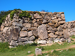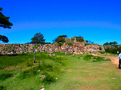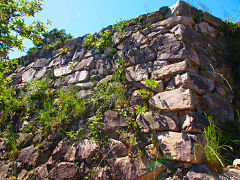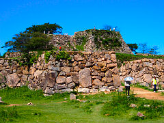 足元を見ると瓦の破片が沢山散らばっています。当時の城の瓦だそうです。城壁はご覧のように相当の高さがあり誤って転落すると大怪我になりますが、そのような事故が起こらないようにガードレールや柵を設けるところが多いですが、ここは何もありません。自然のままになっています。有名になり観光客も多くなっているようです。10月1日から有料化されましたが、今のままの状態で維持管理されることを願いたいものです。