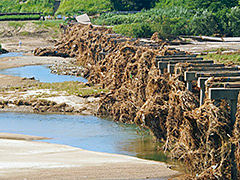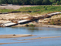 先日の大雨で流れ橋はこのような無残な姿になっています。ゴミが橋桁のところまで着ています。広い木津川なのにここまで水が来たことは恐ろしいことです。普通はこのような流れなのに・・・・ これで3年連続の20回目の流失です。