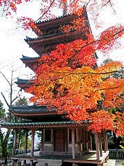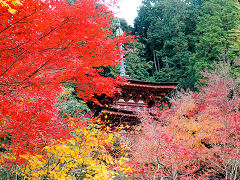 浄瑠璃寺の続きです。本堂と池を挟んで東にある国宝の三重塔ですが、周りの紅葉とマッチして存在感を表しています。三間四方、檜皮葺、高さ15.3mで藤原時代の和様建築です。