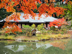 山から下りて同じ加茂町にある浄瑠璃寺に行きました。ここは堀辰雄の「浄瑠璃寺の春」を読んでから何回となく来た気に入った寺院です。海住山寺の紅葉には負けているようですが、例年よりは赤く紅葉しています。本堂には9体の国宝の阿弥陀如来坐像があるので、九体寺とも呼ばれています。