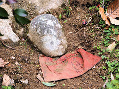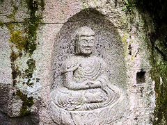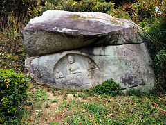 当尾の石仏のメインは、やはりこの「わらいぼとけ」といわれる両側に菩薩を従えた阿弥陀如来坐像ですが、笑っておられます。永仁7年(1299年)二月十五日 願主 岩船寺住僧 大工 末行 という銘文があります。そのとなりに頭だけ出しておられる地蔵石仏があり、「眠り仏」と呼ばれています。
