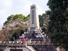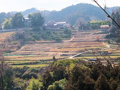 すいせんの丘から眺められる千枚田。奉建塔は楠木正成600年祭記念塔で、正成が戦死した年齢にあわせて43尺(約13m)あります。塔には「非理法権天」と書かれてあります。非は理に勝たず、理は法に勝たず、法は権に勝たず、権は天に勝たずということだそうです。