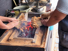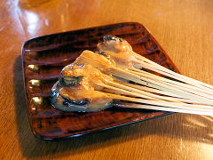 今宮神社に行けば、門前にあるお茶屋で名物の「あぶり餅」を食べなきゃ・・・ ということで、「かざりや」という店に入りました。甘い味噌ダレで炭火で焼いているので香ばしいものでした。これで500円です。