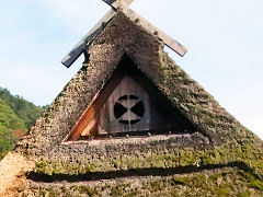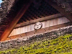 茅葺き屋根には、家紋が掲げてあります。違う地域では防火の願いか「水」と掲げてあるところもありますが、ここは家紋を掲げるようです。燃料の薪が積まれてありました。面白い造形をしています。