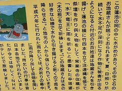 城陽市の観音堂の花菖蒲畑の一角に小さな祠があります。「雨乞い地蔵さん」と呼ばれるお地蔵さんがおられます。この祠の中に水瓶がありその中にお地蔵さんがおられると案内板に書かれていますが、水瓶があることはわかりますがお地蔵さんは確認できません。平成6年の行われた雨乞いでは祈祷の最中に雨が降り出したとか。どんなお地蔵さんなのか見たかったですが、近所の方に話を聞くと雨乞いの時にはどこからかお地蔵さんを持ってくるそうで、この水瓶の中には居られないそうです。