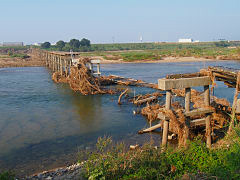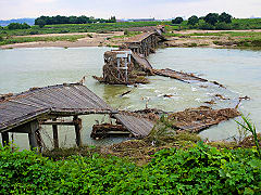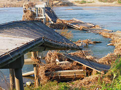 流れ橋のその後はご覧のように無惨な姿をさらけ出しています。時代劇撮影で有名な橋ですが、一般生活用の橋としてもなくてはならないものでもあります。よく見ると途中に梯子が掛かっていたので、修復の調査が始まっているのでしょうか。遠くにもパワーショベルの姿を見ることができます。