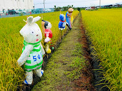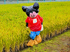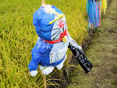 刈り取り間近な田圃に彩りを添えるものは、昔から案山子ですよね。♪山田の中の一本足のかかし 天気のよいのにみの笠着けて・・・♪と歌われていた案山子ですが、現在は様変わりしてアニメのキャラクターが案山子に登場しています。カラフルな案山子です。