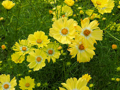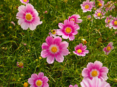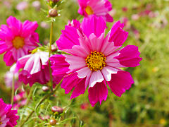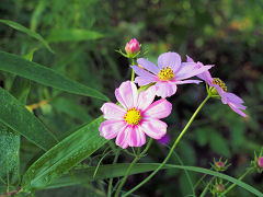 20種のコスモスがあるという中から、黄色のコスモス、ピンクでも模様が入ったもの、「シーシェル」という花弁が筒状になる変わり咲きのコスモスです。