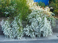 遠くから見ると、ユキヤナギに見えたので今頃?? 近づいてよく見ると小さな菊が咲いていました。その横でオシロイバナも赤い花を沢山咲かせていました。