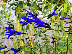 コスモス以外にも花は咲いています。左から、「千日紅(せんにちこう)」、「オーシャンブルー」は朝顔の仲間なので種子で増えるのかと思いきや、宿根草でさし芽で増やすそうです。そして「メドーセイジ」です。