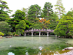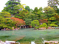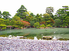 小御所の前に広がる「御池庭」と呼ばれる池を中心とした回遊式庭園です。きれいな庭園なのですが、ご覧のように池の水が濁っていて汚い池になっていました。何が原因でこんなに汚れた池になったのでしょうか。