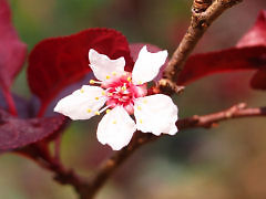 浄瑠璃寺の参道に、紅李(べにすもも)が小さな花を付けていました。スモモは初春の花なのに???