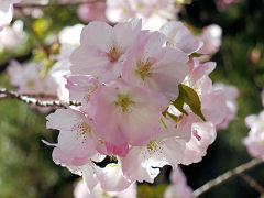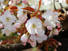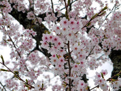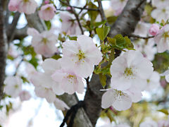 平野神社の桜はソメイヨシノや枝垂れ桜の定番の桜もありますが、本殿前の広場にはこのような品種の桜が咲き誇っています。