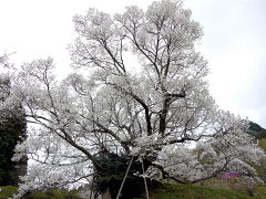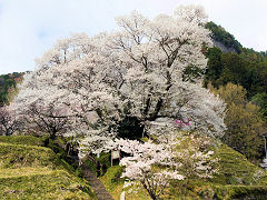 奈良県宇陀市榛原に真言宗室生寺派の「仏隆寺」があります。ここは秋の彼岸花が美しいところとして有名ですが、春のこの桜も見事です。根周7.7m、樹高16m、樹齢900年を超えて県の天然記念物になっています。根株から2mのところで大小11本に分岐しています。この桜は、ヤマザクラとエドヒガンの雑種であるモチヅキザクラだそうです。(動 画)