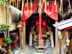 京都市下京区鍛冶屋町に「鉄輪井戸(かなわのいど)」があります。入口は民家の玄関のようになっていますが、入ると細い路地があり、このような祠があり井戸があります。 謡曲『鉄輪(鍋やヤカンを乗せる三本足の五徳をそう呼んだ)』によると、この辺りに住む女が自分を捨てて後妻をめとったことを恨み、貴船神社に丑の刻詣りをしていると鉄輪を頭に乗せ三本足に火をともすと鬼になれるとお告げがあった。それ以来男は悪夢に苦しみ祈祷してもらうと女の鬼が現れるが祈祷により苦しみながら去っていった。遂にこの井戸辺りで息が絶えたということです。 この伝説から、この井戸水を別れたい者に飲ませると後腐れなく縁が切れるということです。なお、この井戸は地下鉄工事の影響で現在は涸れていますが、ペットボトルに水を入れてきてここに供えて持ち帰ると同じ効果があるそうですよ。心当たりのある方は、ペットボトルの水には注意しましょう!!