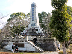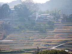 この水仙の丘に、「奉建塔(ほうけんとう)」というものがあります。延元元年5月の湊川の戦いで戦死した楠木正成の没後600年を記念して昭和15年に完成したそうです。御影石で作られ43尺(13m)の高さがあります。43尺は楠木正成の戦死したときの年齢だそうです。振り返ると、春霞に焚き火の煙が漂う段々畑の風景が、目に飛び込んできました。
