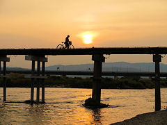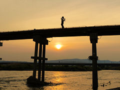 夕焼けに染まる「流れ橋」を撮してみました。『兎追いしかの山 小鮒釣りしかの川 夢は今もめぐりて 忘れがたき故郷』こんな歌が口ずさむ赤い夕日の故郷です。