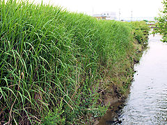 近くに古川と言う名の川が流れています。以前は臭いがするほどのどぶ川でしたが、年々よくなり今は水鳥が飛来するほどのきれいな川になってきています。蛍も復活するのではと期待しています。ススキが一面に生えていますが一部分だけこのように堤が改修されています。何のために改修工事をしたのかわかりません。