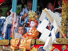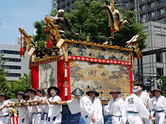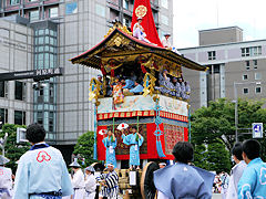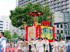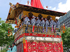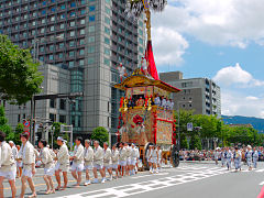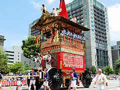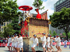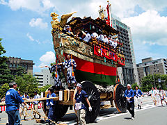 祇園祭は、貞観11年(869年)疫病の災厄除去を祈って始まり、今日のような様式と組織に祇園祭が定着したのは、応仁の乱後の明応9年(1500年)に祭りが復活した時とされています。写真は左から「函谷鉾(かんこくほこ)」、「菊水鉾(きくすいほこ)」、「鶏鉾(にわとりほこ)」です。