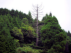 剣豪の故郷、奈良市柳生町に寛永3年(1626)に独眼流「柳生十兵衛」が諸国漫遊の旅に出る際に、祖先の墓参りをしたときに植えたと言われる「十兵衛杉」があります。今は残念ながら昭和48年の落雷により枯れてしまってこのような状態になっていますが、枯れて37年が経っても立ちつくすとは、流石柳生十兵衛ですね。