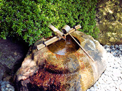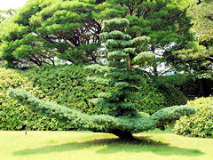 庭園に茶室があり、「つくばい」が小さな水音を響かせていました。涼感を感じさせます。帆掛け舟のような剪定をした樹木がありました。ここまで剪定すると風情がありません。夏の昼下がり誰もいない城南宮でした。