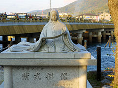 現在の宇治橋は、平成8年3月に架け替えられましたがその橋の袂に紫式部像があります。宇治十帖源氏物語最後の「夢浮橋」により建てられたもの。平等院に向かう参道の両側にはお茶屋が並びお茶の良い香りが一面に漂っていました。川の土手に出ると川の流れに沿って「あじろぎの道」という名が付けられた散策道があります。平等院の庭園も木々の間からチラリと見ることが出来ます。