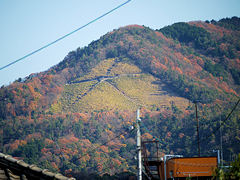 賀茂川と高野川と合流して鴨川になりますが、合流する直前の高野川から五山送り火の「妙法」の「法」と鴨川から見た如意岳の「大」です。35mm換算で400mmの望遠レンズで撮しました。