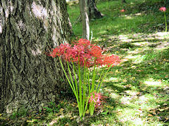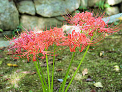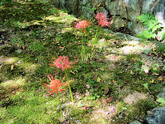 真如堂には萩の他に彼岸花も咲いています。一面に咲いているのではなく、ところどころにひっそりと咲いて初秋の到来を告げているようでした。 『ごんしゃん ごんしゃん どこへゆく 赤いお墓の ひがんばな きょうも手折りに 来たわいな』 北原白秋作詞 山田耕筰作曲の「曼珠沙華(ひがんばな)」をフト思い出させた真如堂の彼岸花でした。
