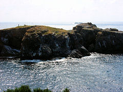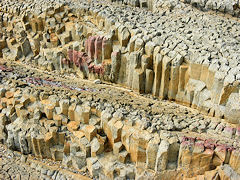 出雲日御碕は、遊歩道があり散策を楽しむことができます。ここは、2~3千万年に噴出した「流紋(りゅうもん)岩」の溶岩からできています。断面が5角形又は6角形の柱状節理になっています。右の写真は、「経島(ふみしま)」でウミネコの繁殖地です。11月下旬に飛来して産卵、子育てをして7月に北に向かって旅立ちます。