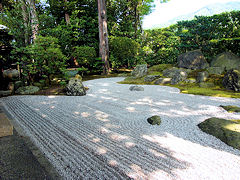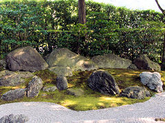 真如堂の東山を借景にした枯山水庭園「涅槃の庭」です。写真が小さいので、分かりにくいかもしれませんが、左が頭部になります。そして、眺められた如意ヶ嶽(大文字山)です。ここの生け垣は、以前は一段低く出来ていたそうですが、現在はこのように高くなっています。住宅などが建って借景庭園でなくなってきたからだそうです。それでも最近テレビのアンテナが見えて借景庭園の維持の難しさが窺えます。