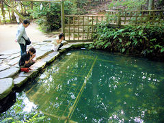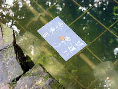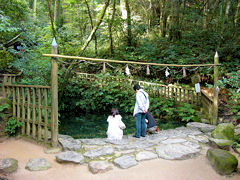 八重垣神社には、縁結び占いの池という「鏡の池」があります。このように占い用紙に百円か十円硬貨を乗せて祈ります。用紙が15分以内に沈むと良縁が早い、30分以上になると縁が遅いといわれていますが、30分も浮いていることは有り得ませんね。そして、近くで沈むと身近な人と、遠くで沈むと遠方の人と結ばれるそうです。そしてそして、良縁を得られた人は二人の晴れ姿を、この鏡の池に写しなさいということです。