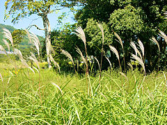 「恭仁宮」周辺では蕎麦の栽培も行われていて、白い花が咲いていました。北アメリカ原産の帰化植物であるセイタカアワダチソウも咲き始めていました。その隣で日本古来のススキが風に揺れていました。このススキは、セイタカアワダチソウに押されて減少していましたが、最近は盛り返して逆転しているようです。