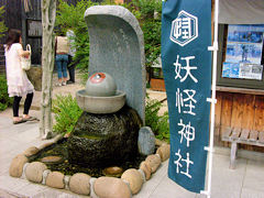 水木しげるロード沿いの酒蔵の看板も、道路の街灯も目玉の絵が描かれています。妖怪神社までありました。ここにも目玉がありクルクルと回っていました。ここまで徹底すれば、それはそれで一つの文化になりますね。