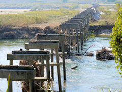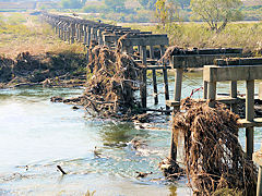 時代劇にはなくてはならない橋である「流れ橋」こと上津屋橋が、先日の台風で木津川が増水して名のとおり橋桁が流されてこのような無惨な姿になっています。橋桁は、ご覧のように川の中の浅瀬に乗り上げています。台風シーズンが完全に終わらないと修復工事はスタートしないので、もう暫くはこのような状態が続くのか?