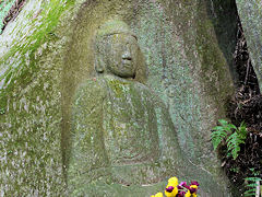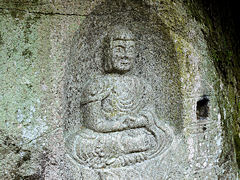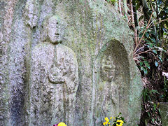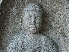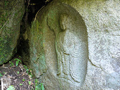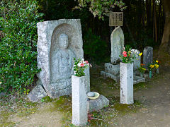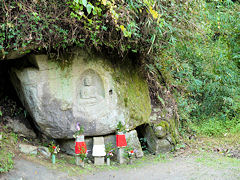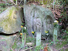 木津川市の浄瑠璃寺・岩船寺一帯を「当尾の里」と呼ばれていて、浄瑠璃寺から岩船寺への約1.5kmの道には石仏が点在しています。その道を歩いてみました。スタートしてまもなく「やぶの中の三尊」がありました。正面が地蔵菩薩、その左が阿弥陀如来、右が十一面観音菩薩です。弘長二年(1262年)という銘文があり、銘文のある当尾の石仏では最古の石仏だそうです。