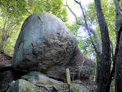 木津川市当尾の里の石仏巡りその5。山道にもこのような無人の売店があり農産物を売っています。八帖岩と名付けられた岩が道を塞ぐように迫り出しています。地震等があれば滑落しそうな岩でした。見上げると紅葉が青空に映えていました。