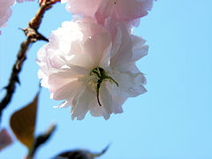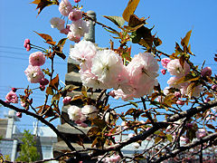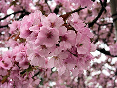 旧北桑田郡京北町、合併で京都市右京区京北上黒田町に春日神社という小さな神社があり、そこに「黒田の百年桜」という樹齢350年のヤマザクラがあります。突然変異で出来た桜で、10~12枚の八重の中に一重が混じる珍種で、紅色の大輪の花が手鞠のように固まって咲きます。突然変異のため種子ができないので、京の桜守として知られている佐野籐右衛門が、約30年に渡る研究により苗作りに成功し、「黒田の百年」と命名されたものです。