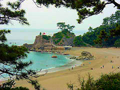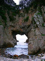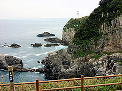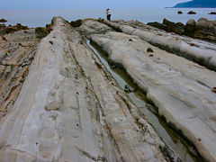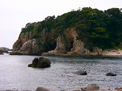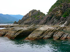 高知県土佐清水市にある景勝地「竜串」で足摺宇和海国立公園に属しています。砂岩泥岩が波食・風食でこのようになったものです。見残し海岸は縦の造形、竜串海岸は横の造形という違いがあります。ここも観光客は少ないようで店を閉じているのが目立ち、寂れている感が否めない観光地です。