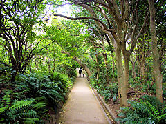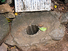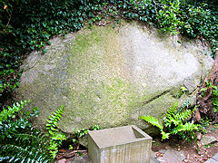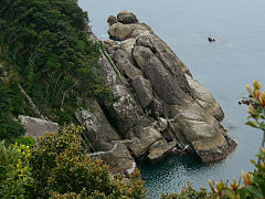 高知県足摺岬その2。岬の周辺はこのようなツバキが沢山植えられています。花咲く頃はさぞかしツバキのトンネルになるのでしょう。足摺七不思議というものがあって、「地獄の穴」は、このように小さい穴ですが、銭を落とすとチリンチリンと音がして落ちていく。その穴は金剛福寺の本堂のすぐ下まで通じていると云われています。そんなに深い穴なのかと恐る恐る覗くと、あとは書かない方が・・・・・ 「弘法大師の爪書き石」は、この岩肌に空海が爪で「南無阿弥陀仏」と彫ったそうですが、よくわからなかったですね。何せ爪で彫ったので今ではわからなくなっているのでしょう。