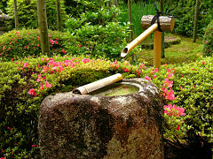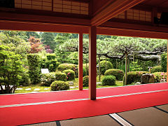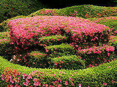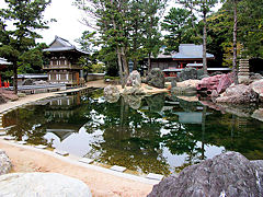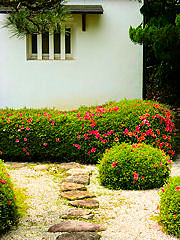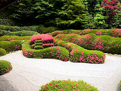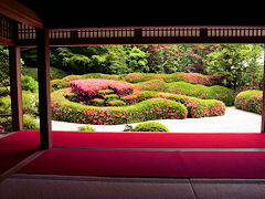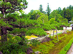 大池寺その2。メインの蓬莱庭園です。江戸初期の寛永年間に小堀遠州の作として伝えられサツキの大刈り込み観賞式枯山水庭園です。白砂に宝船を浮かべて7個の石と小さな刈り込みで、七宝と七福神を象徴しているそうですが、この写真ではよくわかりませんね。