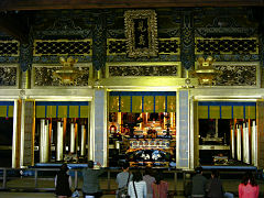 西本願寺です。平成23年に親鸞上人(1173~1262)が亡くなって50年毎に行われる750回の大遠忌法要が行われるので、東西両本願寺とも各種の工事が行われています。御影堂の前に大きな銀杏の木が植えられています。神社仏閣には銀杏の木が植えられていますが、火災が発生したときには銀杏は水を吹き出すと言われるほど水分を含んでいるので、建物の延焼を防ぐために植えられているそうです。その御影堂の内部で皆さんがお参りしている風景です。