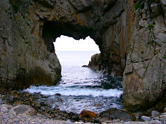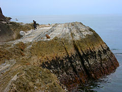 見残し海岸のその3。自然のトンネルが出来ていたり、綺麗な模様が描かれたお椀のようなものがあったりと、長い年月を経て自然が作った芸術を見ることが出来ました。そんなところで釣りをしている人がありました。長閑でゆったりとした時間が流れていました。