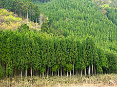 北山杉です。手前を川が流れていて、ホッとするような長閑な風景が見られました。花粉症の人には恐怖の風景かもしれませんね。