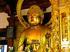 大池寺その3。本堂には、本尊の釈迦牟尼如来坐像(しゃかむににょらいざぞう)が鎮座します。延宝3年(1675年)に修復・彩色され、それから334年経過していますがご覧のように金色色に輝いています。門前には、善峯寺の遊龍の松のような松が植えられています。
