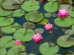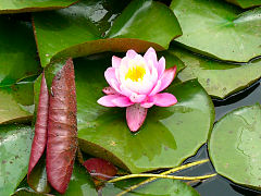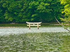 大池寺その4。境内の周辺には心字の池があり、そのひとつの弁天池です。池の所々にはスイレンが群生していてピンク色の花が涼しげに咲いていました。池の中央には鳥居が水没していました。